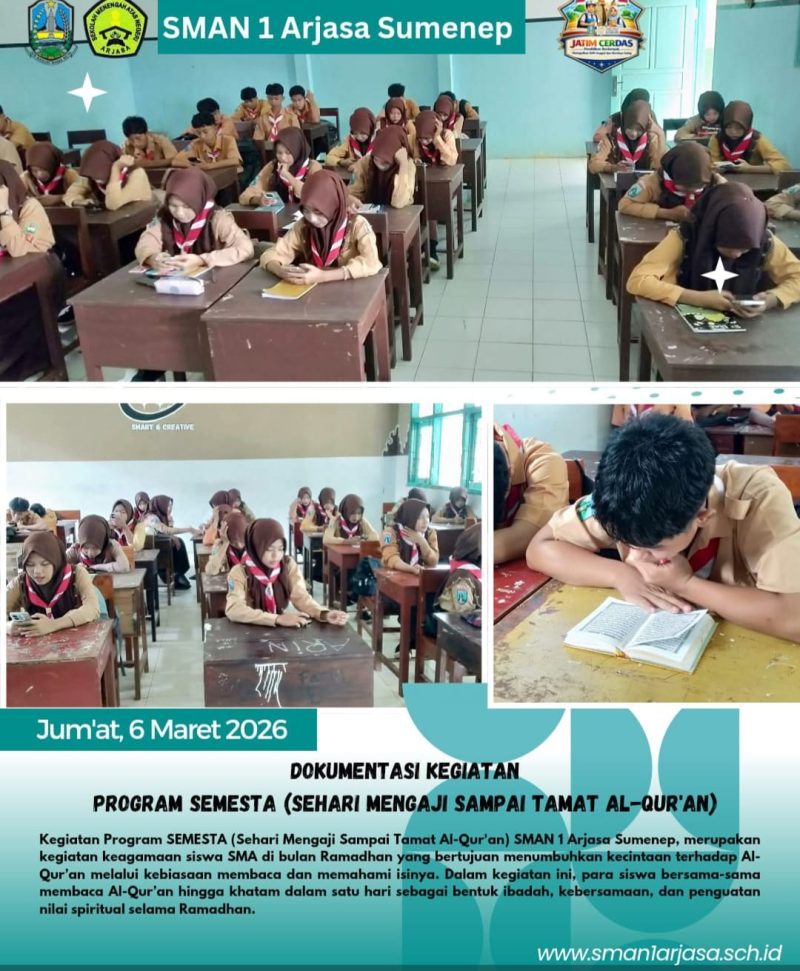 Transatu.id, SUMENEP – Progam Sehari Mengaji Sampai Tamat Al-Qur’an (Semesta) yang di inisiasi oleh Kepala Cabang Pendidikan (Kacapdin) Sumenep, untuk semua lembaga SMA/sederajat dan SMAN I Arjasa menerapkan program tersebut kepada segenap siswa siswinya. Jum’at (06/03/2026).
